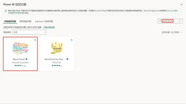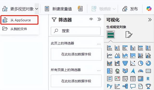 做词云图需要一个PowerBI自身没有带的视觉对象,可点击更多视觉对象将其加载进来。