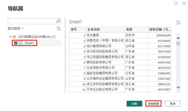 勾选sheet1页面数据,将数据加载进来,同时,点击转化数据,对数据进行预处理。