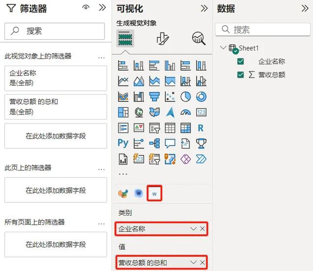 点击加载进来的Word Cloud视觉对象,将企业名称拖入到类别,将营收总额拖入到值。